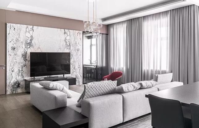 客厅的光线不宜太强,以免影响到视听效果,建议选择具有挡光、隔热功能的厚棉麻或涤纶材质的窗帘。